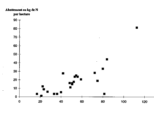 Enfin l'abattement est d'autant plus élevé que le bilan théorique est fort. Pour les bassins versants qui ont une charge en azote relativement modérée (inférieure à 50 kg de N par hectare), le phénomène d'abattement est faible : inférieur à l'équivalent de 10 kg de N par hectare (figure 2).