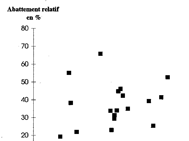 Rappelons que nous appelons abattement la différence entre la concentration moyenne estimée à l'exutoire par la méthode des bilans et le flux mesuré calculé à partir de la concentration moyenne pondérée par les débits. On a calculé de même un abattement relatif qui est une expression du taux de diminution du flux en nitrate par rapport au flux estimé par la méthode des bilans. Il est du plus grand intérêt de connaître les paramètres qui interviennent sur cet abattement qui varie de 5 à 72% sur le sous ensemble de 25 bassins versants (tableau 14 les 25 bassins versants RNB sélectionnés pour la comparaison entre les flux de nitrate mesurés et les flux estimés à partir d'un bilan agronomique) où l'abattement est positif. En effet, cet abattement est une caractéristique de chaque sous bassin versant et il constitue un indicateur de son aptitude à l'auto-épuration.