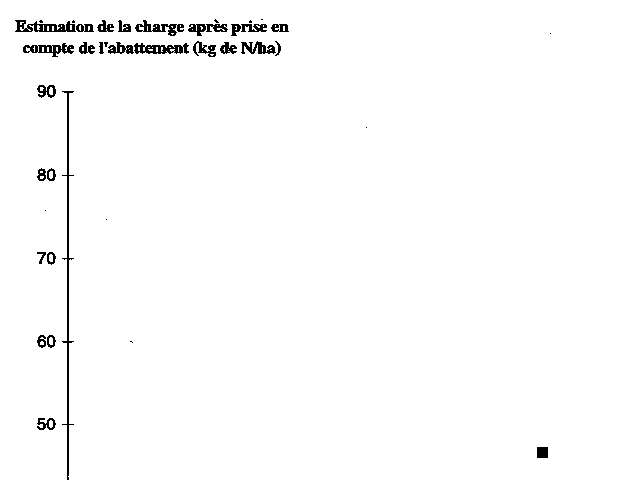 Par contre, il est indispensable d'attirer l'attention sur le phénomène suivant extrèmement important: compte tenu du caractère moins que proportionnel de l'abattement, une diminution de la charge en azote par moitié dans un bassin versant chargé ne se traduira pas par une division par deux du flux d'azote. Prenons l'exemple du bassin versant du Kerouallon (Loc-Eguiner Ploudiry) sous bassin versant de l'Elorn ; sur ce bassin versant, l'excès d'azote est estimé à 146 tonnes pour une surface de 600 hectares et le flux à l'exutoire est de l'ordre de 41 tonnes de N (travaux en cours du Cemagref), si la charge en azote était divisée par deux et représentait 73 tonnes, le flux d'azote sortant est estimé à 29 tonnes. On est donc amené à constater que dans ce cas une diminution de moitié de l'excédent d'azote ne se traduirait que par une diminution d'un tiers du flux d'azote à la sortie du bassin versant. Ce résultat de cette modélisation est extrèmement important à prendre en compte pour éviter de se méprendre sur la portée exacte des mesures qui seraient prises visant à améliorer les bilans d'azote.