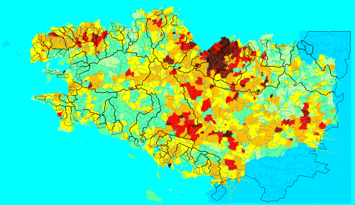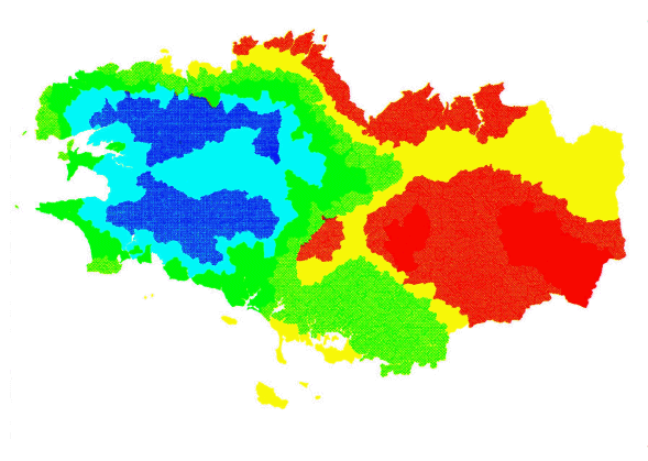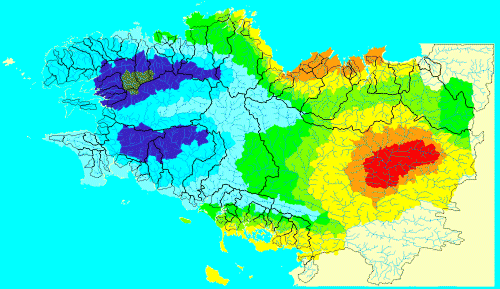 Quand cette rasterisation est achevée, on "importe" le produit de cette rasterisation dans la base de données du MNT. Dans cette base de données chaque maille du Modèle Numérique de Terrain est caractérisée par un certain nombre d'attributs. Parmi ces attributs, il y a les attributs par défaut du MNT, c'est à dire les coordonnées x, y et z (altitude), suivis d'attributs supplémentaires parmi lesquels on trouve par exemple le bilan communal d'azote que l'on vient d'importer et qui se trouve ainsi agrégé par bassins versants. La carte 13 montre le résultat de cette agrégation dans le cas du découpage de la Bretagne en 94 bassins principaux de plus de 2 000 ha. On peut de la même façon agréger ces données en tout autre découpage de la région en bassins versants et en sous bassins versants. Des illustrations de cette fonction seront données plus loin.