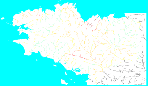En divisant le flux moyen annuel d'azote estimé par "l'azote cumulé" et le flux moyen annuel d'eau estimé par la "pluie cumulée", on obtient une estimation de la concentration moyenne annuelle en nitrates d'origine agricole de l'eau en toute maille du Modèle Numérique de Terrain. Ce nouvel attribut peut être visualisé surl'ensemble du MNT (Carte 16), ou seulement sur tout ou partie du réseau hydrographique estimé (Carte 17).