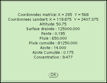 On peut en tout point du Modèle Numérique de Terrain interroger la base de données ainsi constituée qui caractérise chacune de ses mailles. On voit sur la figure 1 le résultat d'une telle interrogation ponctuelle avec le logiciel MntSurf.