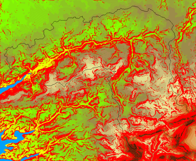 Sur fond d'un codage hypsomètrique des altitudes du MNT (un codage hypsométrique en classes d'altitude de dix mètres a été utilisé), on peut représenter individuellement ou en les combinant les contours des quatre couches d'informations produites.